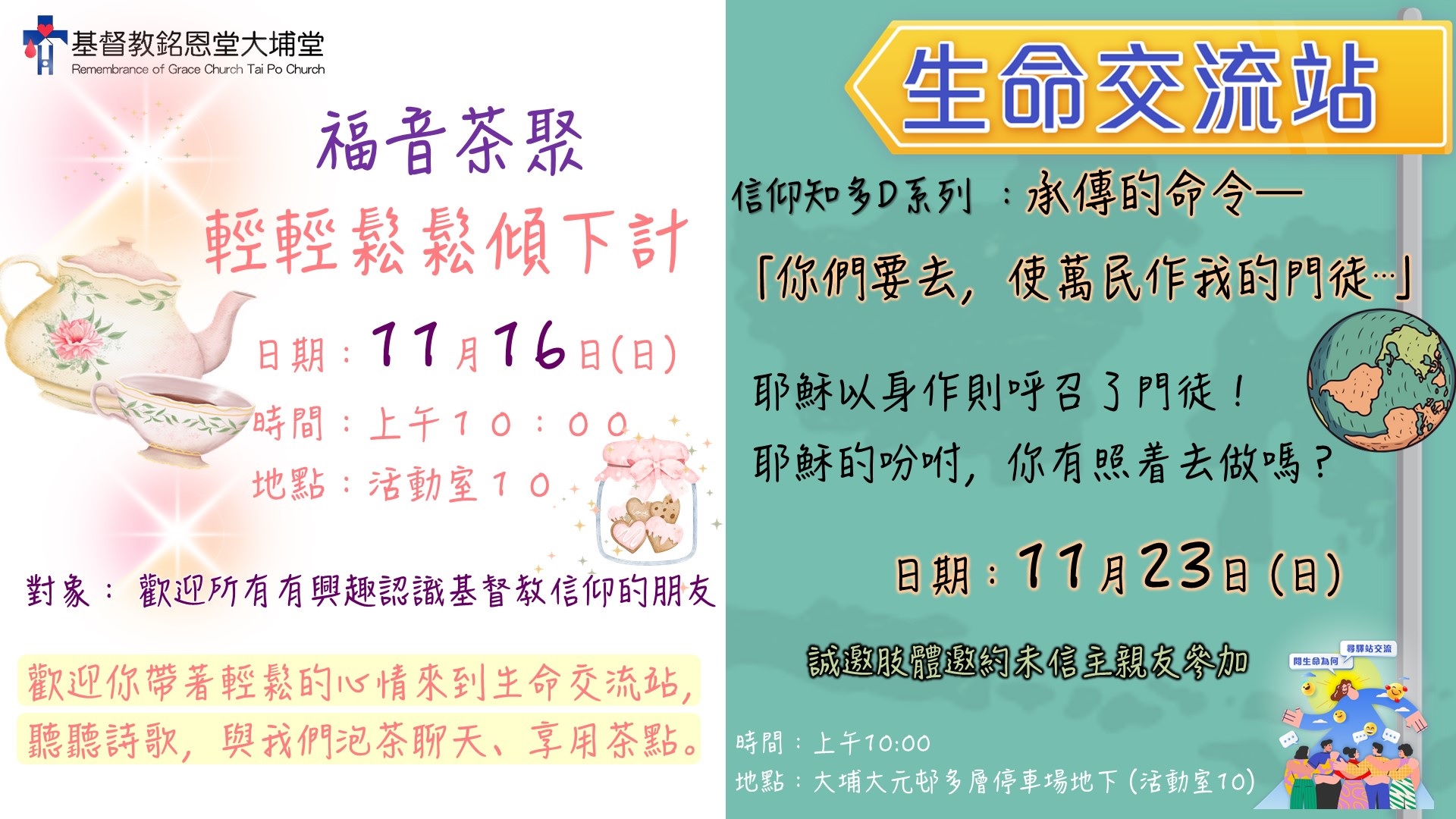 [福音茶聚]11月16日(日) 主題:輕輕鬆鬆傾吓計 內容:歡迎你帶著輕鬆的心情來到生命交流站,聽聽詩歌,與我們泡茶聊天、享用茶點。