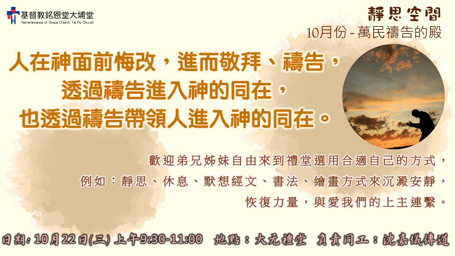 邀請你自由來到大元禮堂的靜思空間,透過安靜、禱告、繪畫、書法等不同平台,與愛你、賜平安的上主連繫。