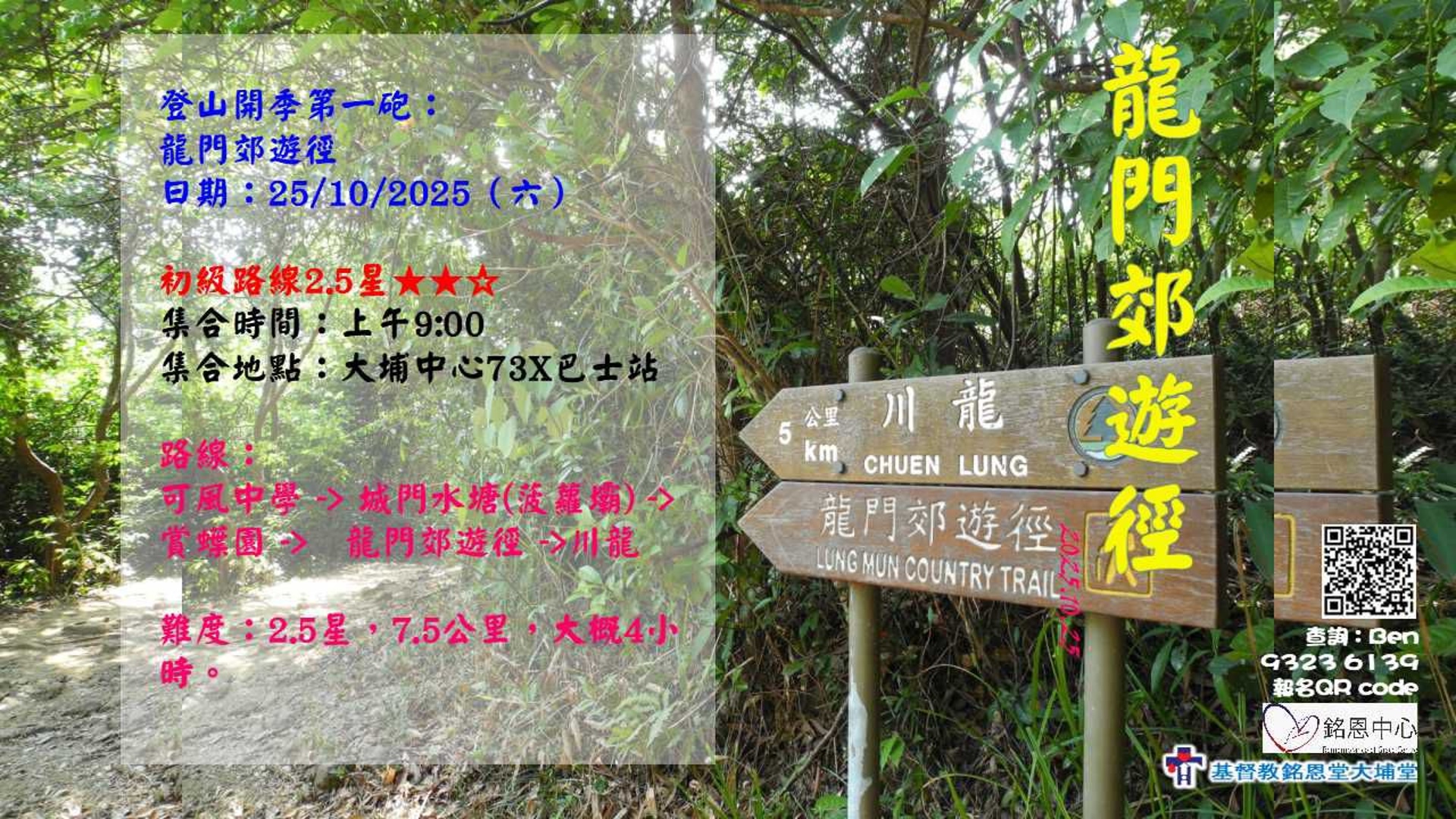 難度:初級路線2.5星,7.5公里,大約4小時,報名參加請聯絡Ben 9323 6139。