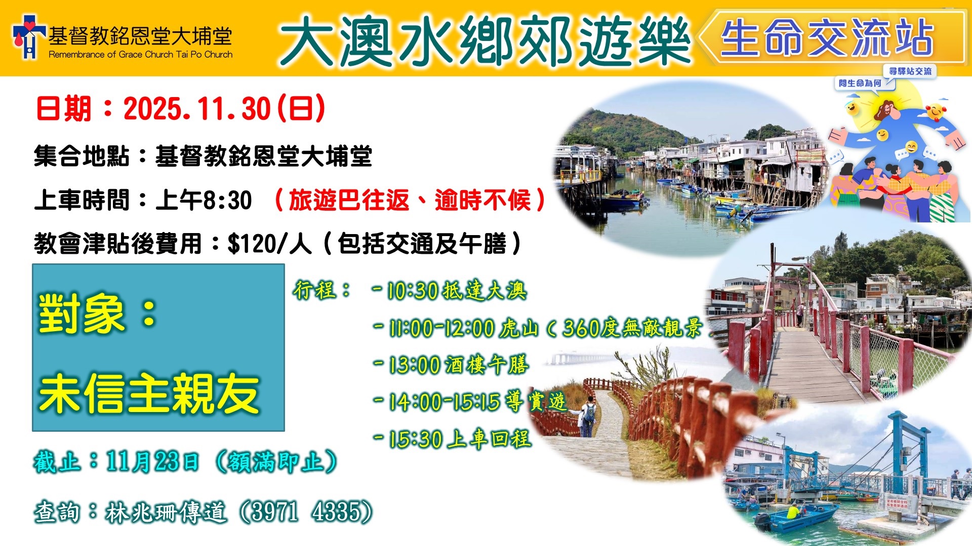 教會津貼後費用:$120/人(包括交通及午膳)