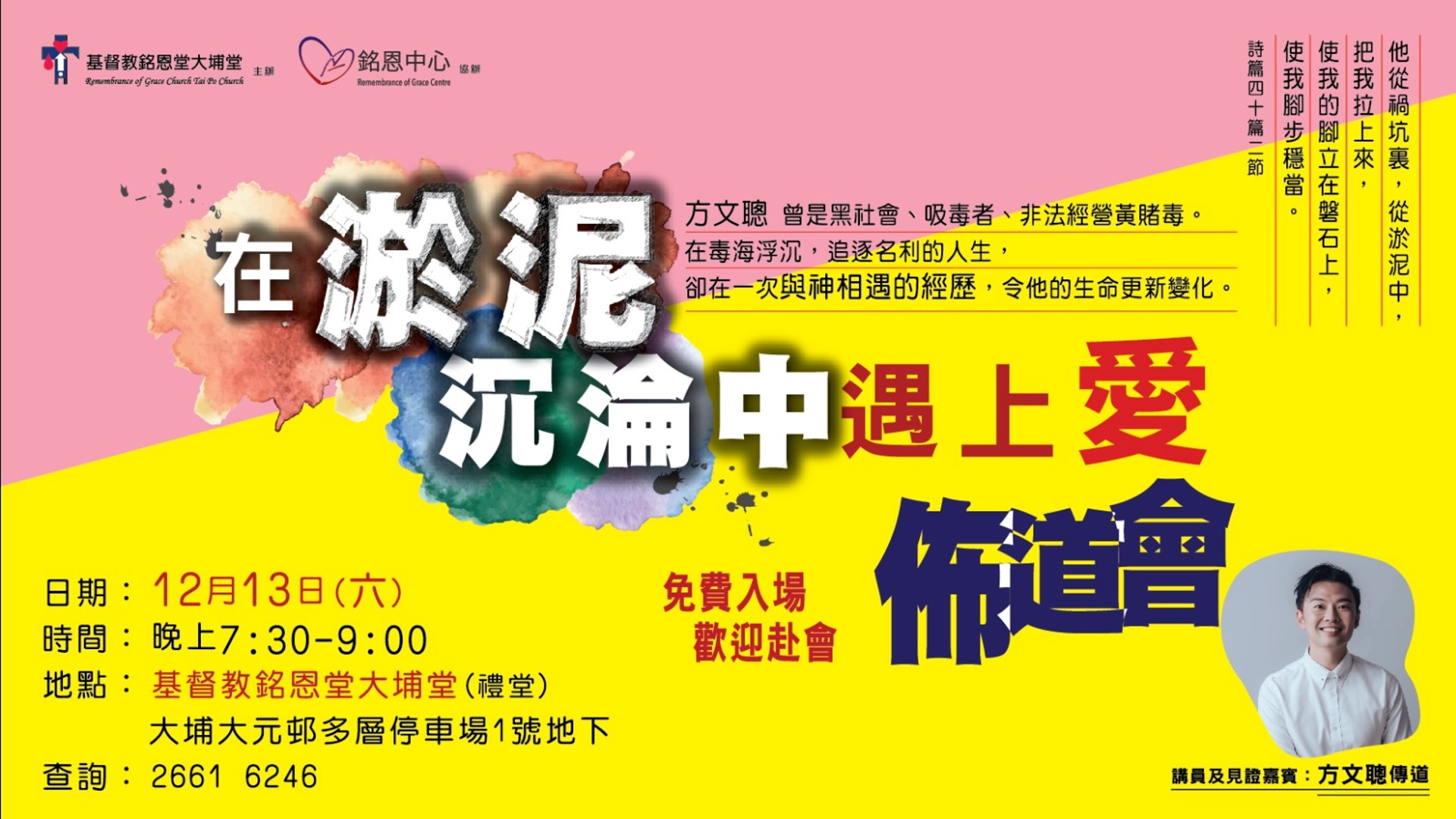 地點:基督教銘恩堂大埔堂禮堂(大埔大元邨多層停車場1號地下