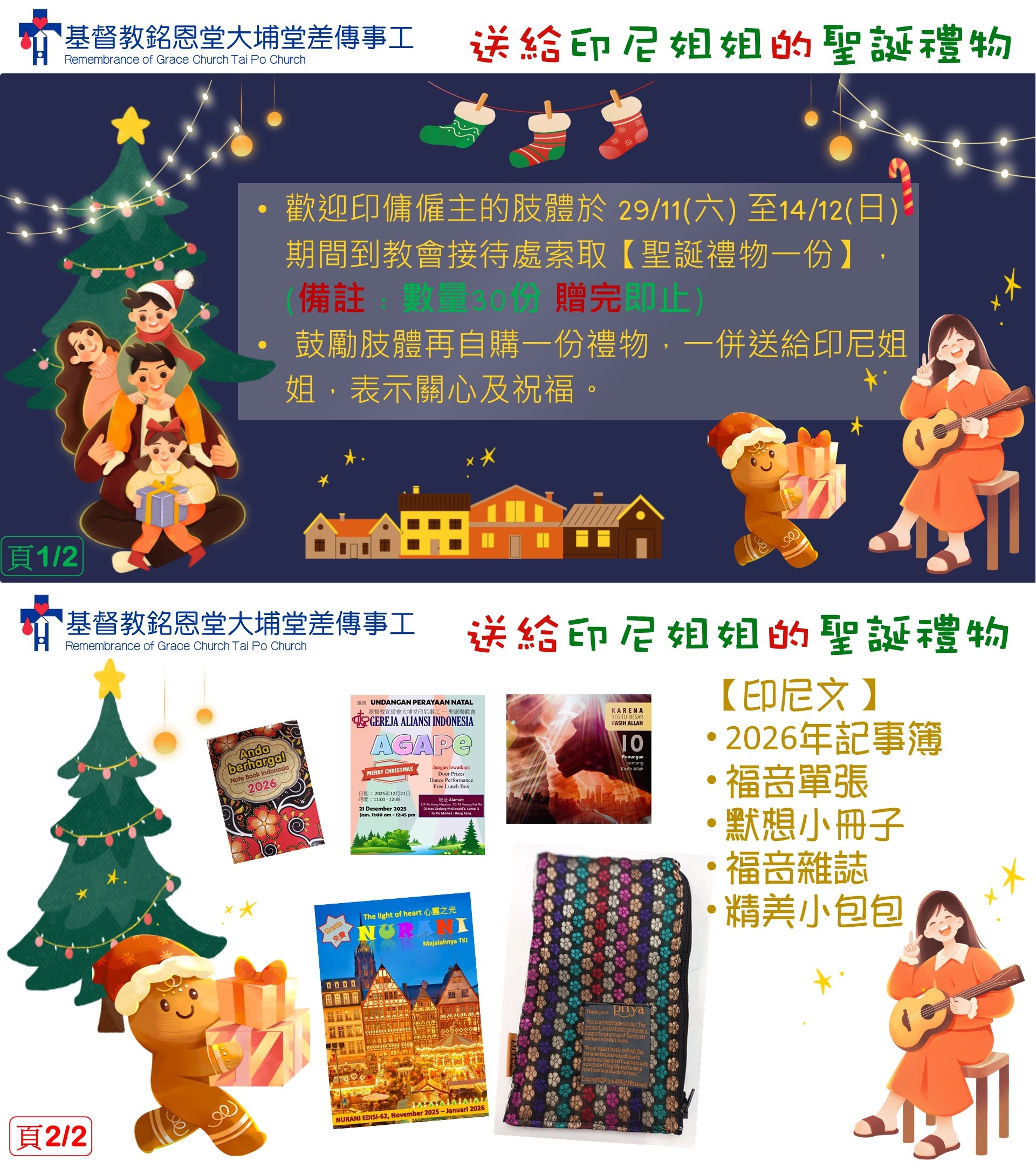 期間到教會接待處索取【聖誕禮物一份】,包括有印尼文