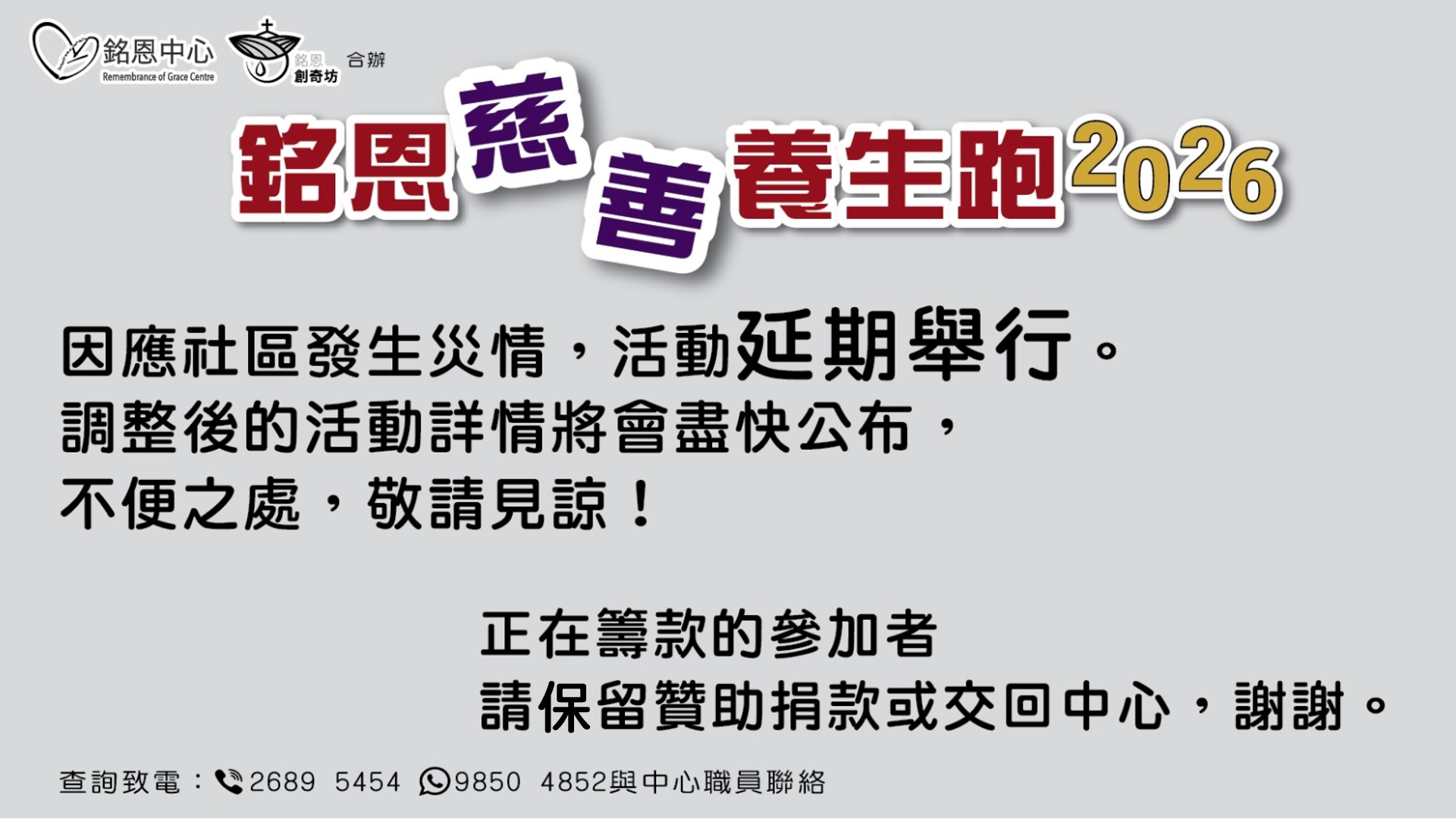 原定於2026年1月3日的「銘恩慈善養生跑2026」,因應社區發生災情,活動會延期舉行。調整後的活動詳情將會盡快公布,不便之處,敬請見諒!